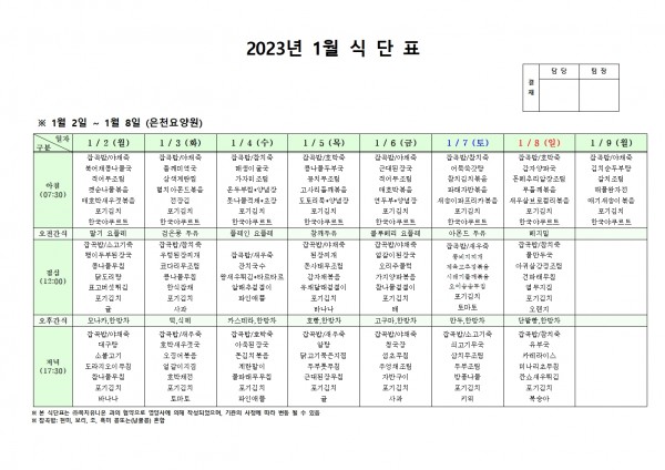 23년 1월 첫째주 식단표 페이지 정보 작성자 은천노인복지회 작성일22-12-30 15:21 조회86,722회 댓글0건 관련링크 이전글 다음글 목록 답변 본문 . 이전글 다음글 목록 답변