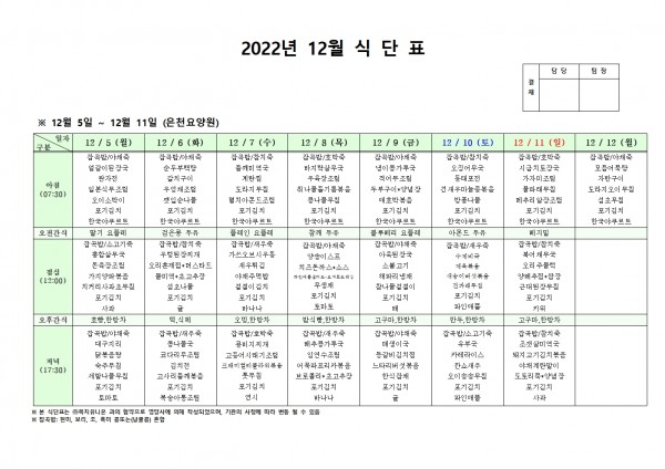 12월 첫째주 식단표 페이지 정보 작성자 은천노인복지회 작성일22-12-01 17:14 조회90,570회 댓글0건 관련링크 이전글 다음글 목록 답변 본문 . 이전글 다음글 목록 답변