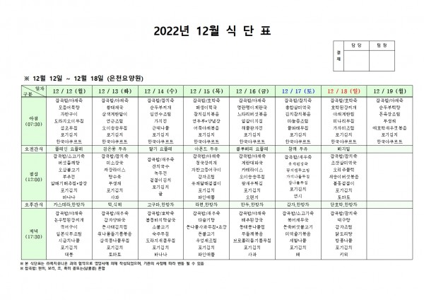 12월 둘째주 식단표 페이지 정보 작성자 은천노인복지회 작성일22-12-08 14:20 조회89,857회 댓글0건 관련링크 이전글 다음글 목록 답변 본문 . 이전글 다음글 목록 답변