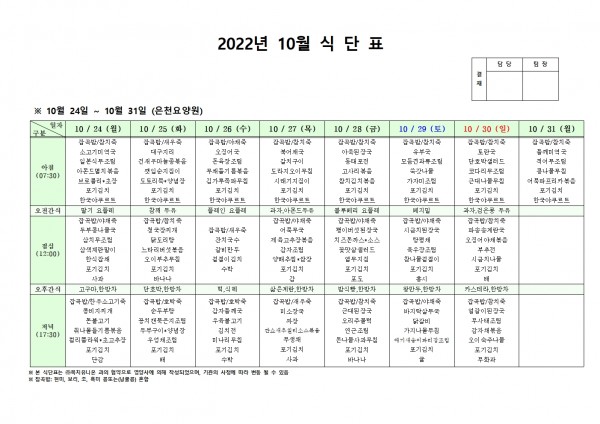 10월 넷째주 식단표 페이지 정보 작성자 은천노인복지회 작성일22-10-20 15:06 조회94,385회 댓글0건 관련링크 이전글 다음글 목록 답변 본문 . 이전글 다음글 목록 답변