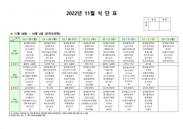 11월 넷째주 식단표 페이지 정보 작성자 은천노인복지회 작성일22-11-24 16:56 조회91,908회 댓글0건 관련링크 이전글 다음글 목록 답변 본문 . 이전글 다음글 목록 답변