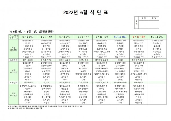 6월 둘째주 식단표 페이지 정보 작성자 은천노인복지회 작성일22-06-03 09:34 조회104,755회 댓글0건 관련링크 이전글 다음글 목록 답변 본문 . 이전글 다음글 목록 답변