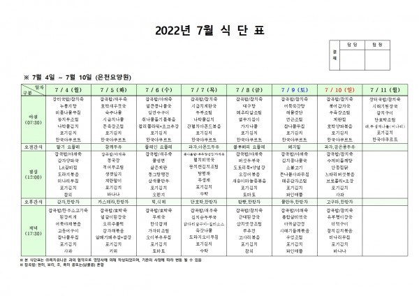 7월 첫째주 식단표 페이지 정보 작성자 은천노인복지회 작성일22-06-30 17:17 조회102,294회 댓글0건 관련링크 이전글 다음글 목록 답변 본문 . 이전글 다음글 목록 답변