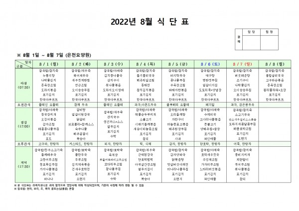 8월 첫째주 식단표 페이지 정보 작성자 은천노인복지회 작성일22-08-01 13:36 조회101,660회 댓글0건 관련링크 이전글 다음글 목록 답변 본문 . 이전글 다음글 목록 답변