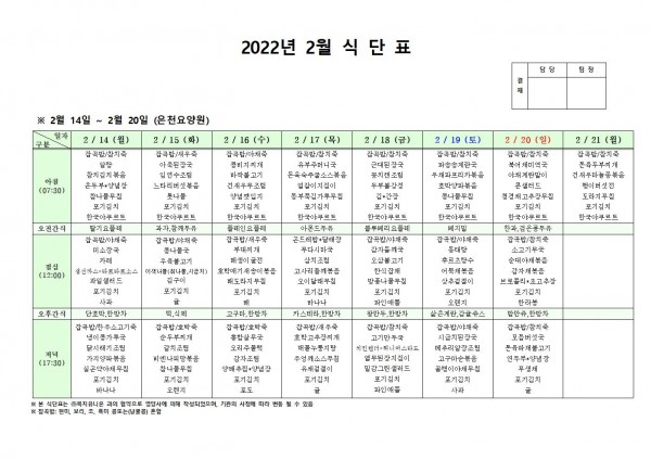 2월 셋째주 식단표 페이지 정보 작성자 은천노인복지회 작성일22-02-10 16:28 조회119,886회 댓글0건 관련링크 이전글 다음글 목록 답변 본문 . 이전글 다음글 목록 답변