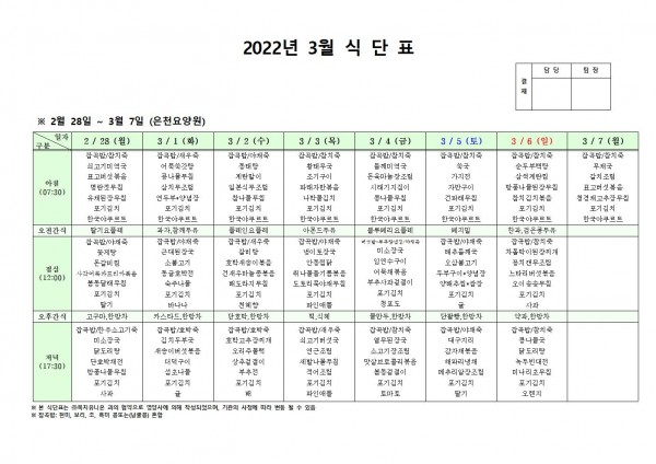 3월 첫째주 식단표 페이지 정보 작성자 은천노인복지회 작성일22-02-25 09:22 조회117,052회 댓글0건 관련링크 이전글 다음글 목록 답변 본문 . 이전글 다음글 목록 답변