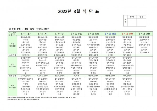 3월 둘째주 식단표 페이지 정보 작성자 은천노인복지회 작성일22-03-04 09:58 조회115,111회 댓글0건 관련링크 이전글 다음글 목록 답변 본문 . 이전글 다음글 목록 답변