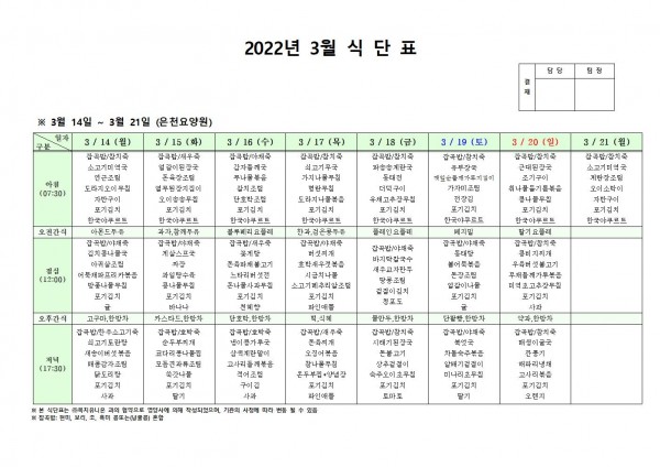 3월 셋째주 식단표 페이지 정보 작성자 은천노인복지회 작성일22-03-11 16:43 조회115,103회 댓글0건 관련링크 이전글 다음글 목록 답변 본문 . 이전글 다음글 목록 답변
