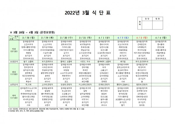 3월 다섯째주 식단표 페이지 정보 작성자 은천노인복지회 작성일22-03-25 10:40 조회113,512회 댓글0건 관련링크 이전글 다음글 목록 답변 본문 . 이전글 다음글 목록 답변