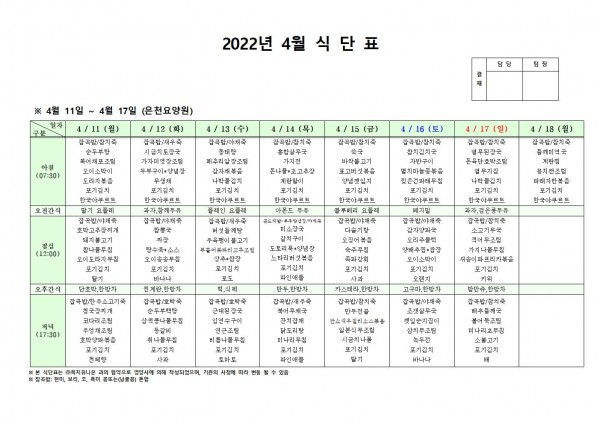 4월 둘째주 식단표 페이지 정보 작성자 은천노인복지회 작성일22-04-11 16:27 조회111,867회 댓글0건 관련링크 이전글 다음글 목록 답변 본문 . 이전글 다음글 목록 답변