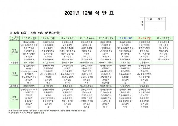 12월 셋째주 식단표 페이지 정보 작성자 은천노인복지회 작성일21-12-15 11:52 조회123,183회 댓글0건 관련링크 이전글 다음글 목록 답변 본문 . 이전글 다음글 목록 답변