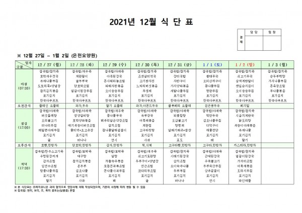 12월 다섯째주 식단표 페이지 정보 작성자 은천노인복지회 작성일21-12-23 17:14 조회123,104회 댓글0건 관련링크 이전글 다음글 목록 답변 본문 . 이전글 다음글 목록 답변