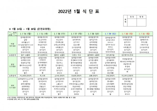 1월 넷째주 식단표 페이지 정보 작성자 은천노인복지회 작성일22-01-25 09:24 조회120,782회 댓글0건 관련링크 이전글 다음글 목록 답변 본문 . 이전글 다음글 목록 답변