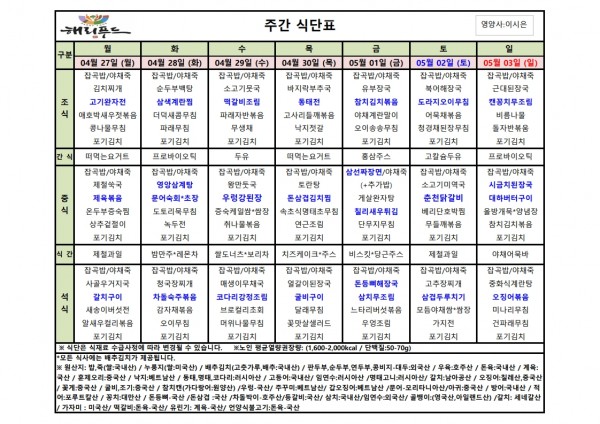 4월 넷째주 식단표 페이지 정보 작성자 은천노인복지회 작성일26-04-27 17:08 조회186회 댓글0건 관련링크 다음글 목록 답변 본문 4월 넷째주 어르신 식단표 안내해 드립니다. 정성과 영양을 담아 준비하겠습니다. 다음글 목록 답변