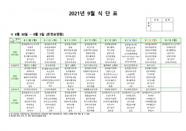 9월 첫째주 식단표 페이지 정보 작성자 은천노인복지회 작성일21-08-26 17:14 조회129,473회 댓글0건 관련링크 이전글 다음글 목록 답변 본문 . 이전글 다음글 목록 답변