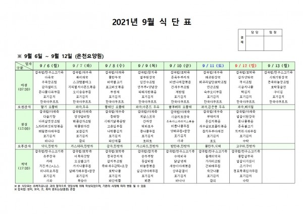 9월 둘째주 식단표 페이지 정보 작성자 은천노인복지회 작성일21-09-02 16:30 조회129,294회 댓글0건 관련링크 이전글 다음글 목록 답변 본문 . 이전글 다음글 목록 답변
