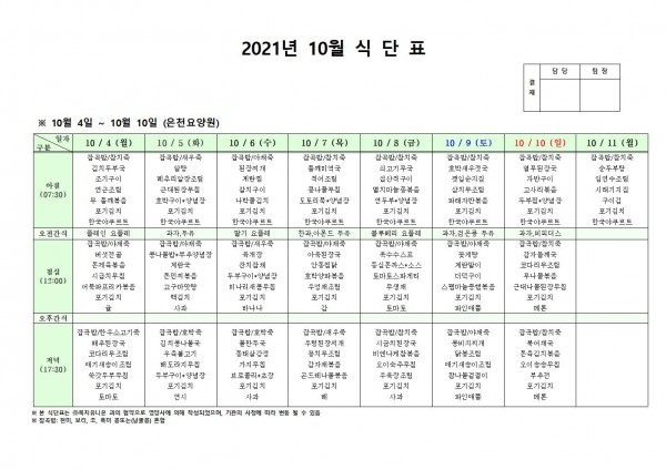 10월 첫째주 식단표 페이지 정보 작성자 은천노인복지회 작성일21-09-30 16:01 조회127,988회 댓글0건 관련링크 이전글 다음글 목록 답변 본문 . 이전글 다음글 목록 답변