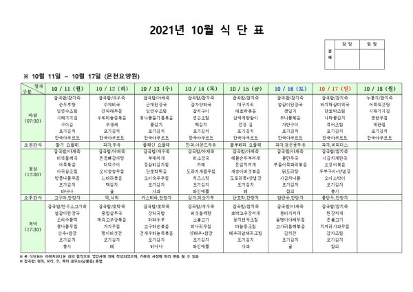 10월 둘째주 식단표 페이지 정보 작성자 은천노인복지회 작성일21-10-12 10:03 조회127,350회 댓글0건 관련링크 이전글 다음글 목록 답변 본문 . 이전글 다음글 목록 답변