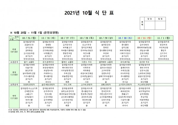 10월 넷째주 식단표 페이지 정보 작성자 은천노인복지회 작성일21-10-26 08:56 조회126,786회 댓글0건 관련링크 이전글 다음글 목록 답변 본문 . 이전글 다음글 목록 답변