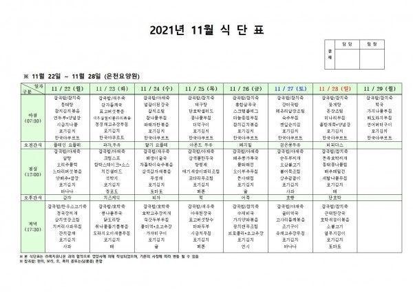 11월 넷째주 식단표 페이지 정보 작성자 은천노인복지회 작성일21-11-25 17:12 조회125,855회 댓글0건 관련링크 이전글 다음글 목록 답변 본문 . 이전글 다음글 목록 답변