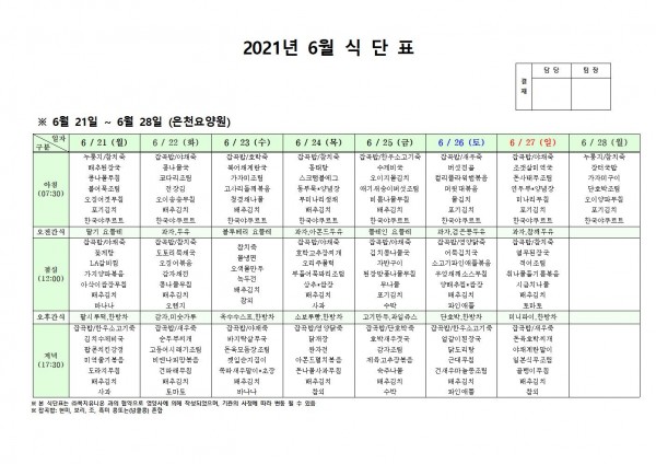 6월 넷째주 식단표 페이지 정보 작성자 은천노인복지회 작성일21-06-17 15:01 조회134,168회 댓글0건 관련링크 이전글 다음글 목록 답변 본문 . 이전글 다음글 목록 답변