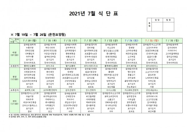 7월 셋째주 식단표 페이지 정보 작성자 은천노인복지회 작성일21-07-22 11:18 조회133,205회 댓글0건 관련링크 이전글 다음글 목록 답변 본문 . 이전글 다음글 목록 답변