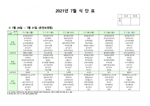 7월 넷째주 식단표 페이지 정보 작성자 은천노인복지회 작성일21-08-05 10:26 조회132,201회 댓글0건 관련링크 이전글 다음글 목록 답변 본문 . 이전글 다음글 목록 답변