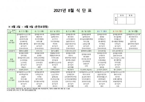 8월 첫째주 식단표 페이지 정보 작성자 은천노인복지회 작성일21-08-05 10:26 조회132,245회 댓글0건 관련링크 이전글 다음글 목록 답변 본문 . 이전글 다음글 목록 답변