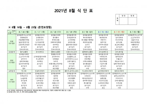 8월 셋째주 식단표 페이지 정보 작성자 은천노인복지회 작성일21-08-12 17:43 조회131,304회 댓글0건 관련링크 이전글 다음글 목록 답변 본문 . 이전글 다음글 목록 답변