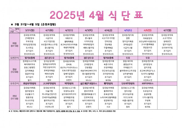 2025년 4월 첫주 식단표 페이지 정보 작성자 은천노인복지회 작성일25-03-28 10:25 조회14,170회 댓글0건 관련링크 이전글 다음글 목록 답변 본문 . 이전글 다음글 목록 답변