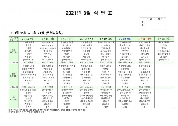 3월 셋째주 식단표 페이지 정보 작성자 은천노인복지회 작성일21-03-12 11:41 조회144,261회 댓글0건 관련링크 이전글 다음글 목록 답변 본문 3월 셋째주 식단표[이 게시물은 은천노인복지회님에 의해 2021-03-12 17:18:24 공지사항에서 이동 됨] 이전글 다음글 목록 답변