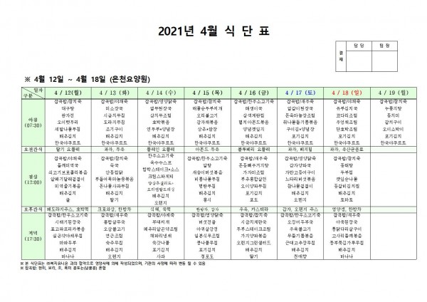 4월 둘째주 식단표 페이지 정보 작성자 은천노인복지회 작성일21-04-08 19:12 조회140,321회 댓글0건 관련링크 이전글 다음글 목록 답변 본문 4월 둘째주 식단표 이전글 다음글 목록 답변