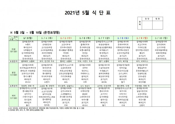 5월 첫째주 식단표 페이지 정보 작성자 은천노인복지회 작성일21-05-03 13:44 조회138,698회 댓글0건 관련링크 이전글 다음글 목록 답변 본문 5월 식단표 이전글 다음글 목록 답변