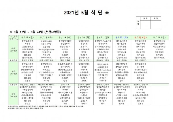 5월 셋째주 식단표 페이지 정보 작성자 은천노인복지회 작성일21-05-13 19:27 조회136,951회 댓글0건 관련링크 이전글 다음글 목록 답변 본문 5월 셋째주 식단표 이전글 다음글 목록 답변