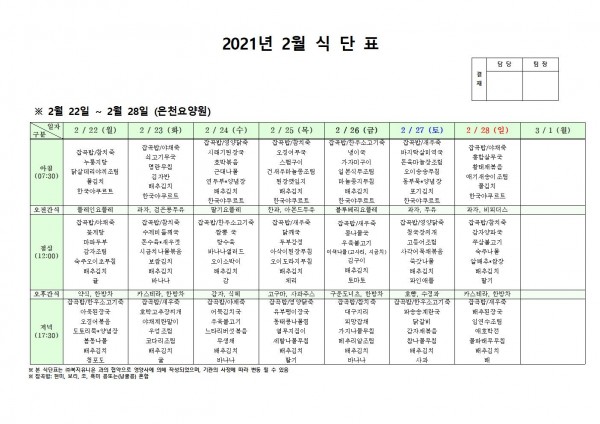 2월 넷째주 식단표 페이지 정보 작성자 은천노인복지회 작성일21-02-19 12:05 조회145,741회 댓글0건 관련링크 이전글 다음글 목록 답변 본문 2월 4주 식단표 [이 게시물은 은천노인복지회님에 의해 2021-03-12 17:18:24 공지사항에서 이동 됨] 이전글 다음글 목록 답변
