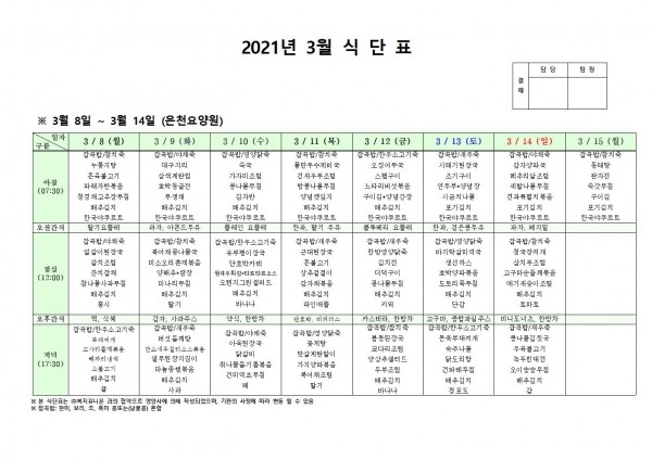 3월 둘째주 식단표 페이지 정보 작성자 은천노인복지회 작성일21-03-04 17:55 조회144,724회 댓글0건 관련링크 이전글 다음글 목록 답변 본문 3월 식단표 [이 게시물은 은천노인복지회님에 의해 2021-03-12 17:18:24 공지사항에서 이동 됨] 이전글 다음글 목록 답변
