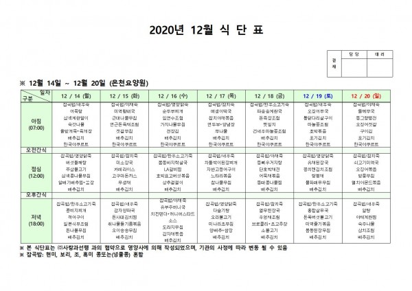 12월 셋째주 식단표 페이지 정보 작성자 은천노인복지회 작성일20-12-15 13:41 조회153,831회 댓글0건 관련링크 이전글 다음글 목록 답변 본문 . 이전글 다음글 목록 답변