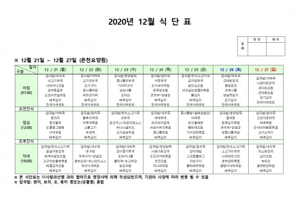 12월 넷째주 식단표 페이지 정보 작성자 은천노인복지회 작성일20-12-21 17:39 조회153,388회 댓글0건 관련링크 이전글 다음글 목록 답변 본문 . 이전글 다음글 목록 답변