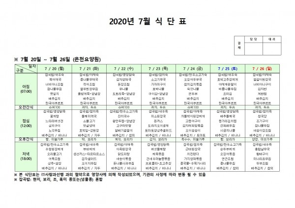 7월 넷째주 식단표 페이지 정보 작성자 은천노인복지회 작성일20-08-10 11:31 조회166,499회 댓글0건 관련링크 이전글 다음글 목록 답변 본문 . 이전글 다음글 목록 답변