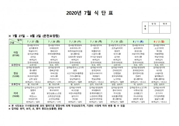 7월 다섯째주 식단표 페이지 정보 작성자 은천노인복지회 작성일20-08-10 11:32 조회165,698회 댓글0건 관련링크 이전글 다음글 목록 답변 본문 . 이전글 다음글 목록 답변