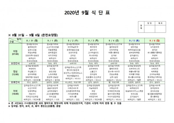 9월 첫째주 식단표 페이지 정보 작성자 은천노인복지회 작성일20-09-07 14:40 조회163,120회 댓글0건 관련링크 이전글 다음글 목록 답변 본문 * 이전글 다음글 목록 답변