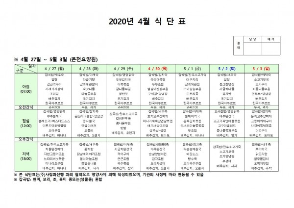 4월 넷째주 식단표 페이지 정보 작성자 은천노인복지회 작성일20-05-04 15:11 조회175,164회 댓글0건 관련링크 이전글 다음글 목록 답변 본문 . 이전글 다음글 목록 답변