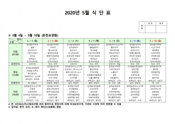 5월 첫째주 식단표 페이지 정보 작성자 은천노인복지회 작성일20-05-18 16:01 조회173,209회 댓글0건 관련링크 이전글 다음글 목록 답변 본문 . 이전글 다음글 목록 답변