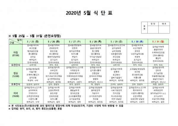 5월 넷째주 식단표 페이지 정보 작성자 은천노인복지회 작성일20-06-01 16:48 조회170,956회 댓글0건 관련링크 이전글 다음글 목록 답변 본문 . 이전글 다음글 목록 답변
