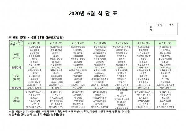 6월 셋째주 식단표 페이지 정보 작성자 은천노인복지회 작성일20-06-22 16:16 조회169,383회 댓글0건 관련링크 이전글 다음글 목록 답변 본문 . 이전글 다음글 목록 답변