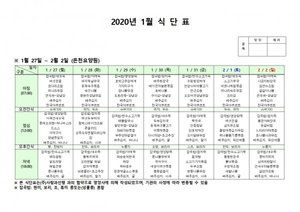 1월 넷째주 식단표 페이지 정보 작성자 은천노인복지회 작성일20-02-04 09:37 조회184,577회 댓글0건 관련링크 이전글 다음글 목록 답변 본문 1월 넷째주 식단표입니다. 이전글 다음글 목록 답변