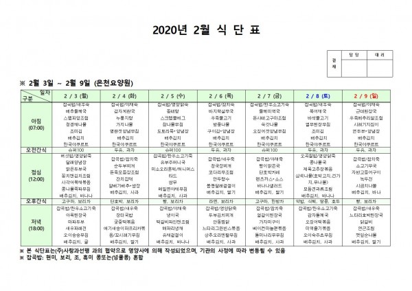 2월 첫째주 식단표 페이지 정보 작성자 은천노인복지회 작성일20-02-11 10:22 조회183,135회 댓글0건 관련링크 이전글 다음글 목록 답변 본문 . 이전글 다음글 목록 답변