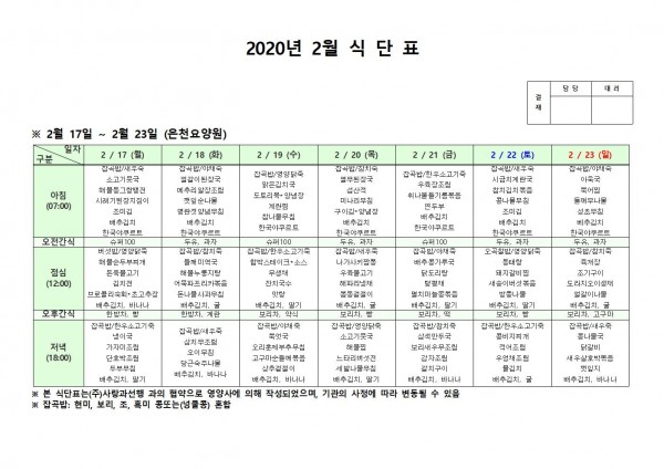 2월 셋째주 식단표 페이지 정보 작성자 은천노인복지회 작성일20-02-24 11:02 조회181,548회 댓글0건 관련링크 이전글 다음글 목록 답변 본문 . 이전글 다음글 목록 답변