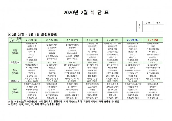 2월 넷째주 식단표 페이지 정보 작성자 은천노인복지회 작성일20-03-02 13:41 조회180,394회 댓글0건 관련링크 이전글 다음글 목록 답변 본문 2월 넷째주 식단표입니다 이전글 다음글 목록 답변