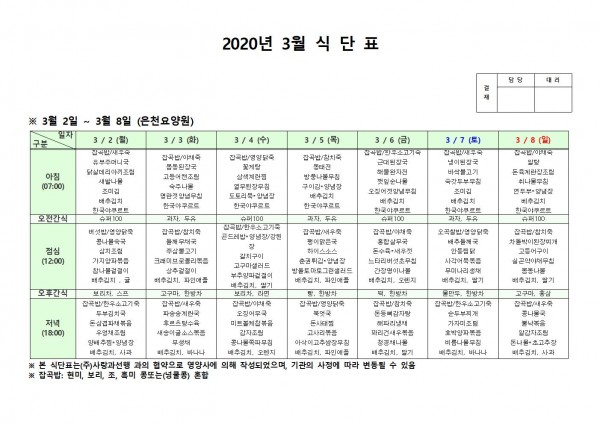 3월 첫째주 식단표 페이지 정보 작성자 은천노인복지회 작성일20-03-09 11:55 조회180,417회 댓글0건 관련링크 이전글 다음글 목록 답변 본문 . 이전글 다음글 목록 답변